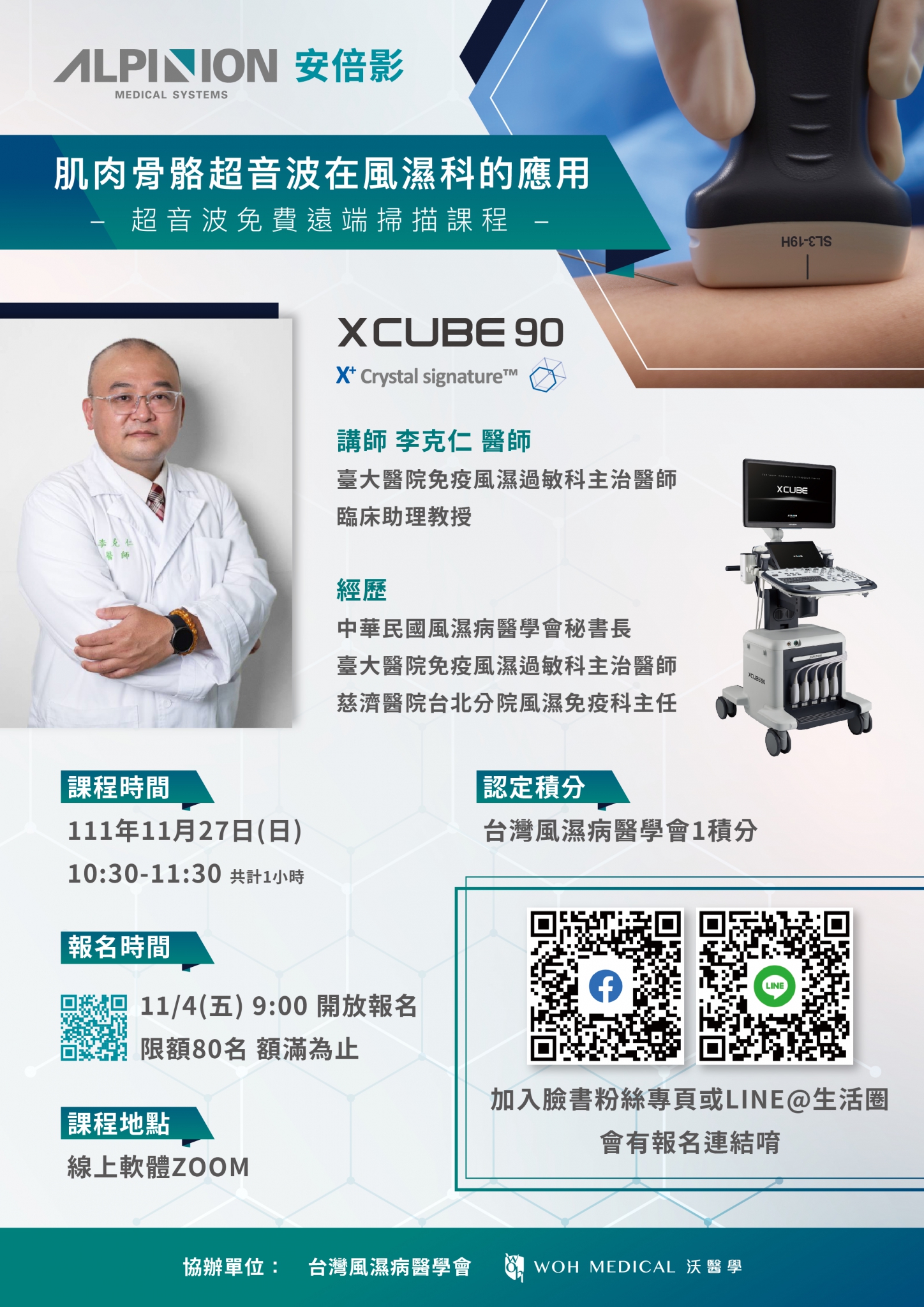 非常榮幸能邀請到 臺大醫院免疫風濕過敏科 🔥 李克仁醫師 🔥 擔任這次課程講師,為大家帶來肌肉骨骼超音波在風濕科的應用超音波課程。
